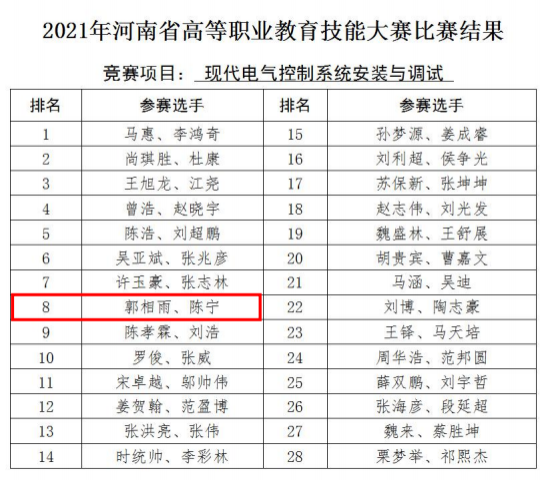 机电工程学院在2021年河南省高等职业教育技能大赛“现代电气控制系统安装与调试”赛项获二等奖