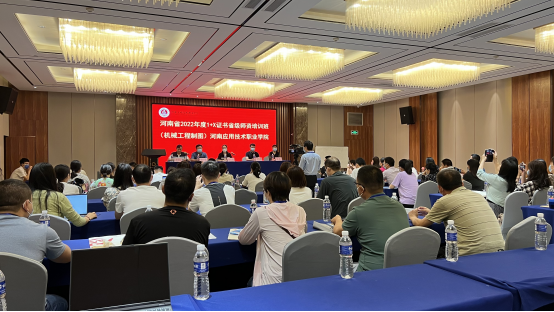 2022年7月25日上午,由河南省教育厅主办、河南应用技术职业学院机电工程学院承办的“机械工程制图1+X”技能证书省级师资培训(线下)班在郑州市杜康大酒店正式开班。我校副校长陈君丽,广州中望龙腾软件股份有限公司大区经理郑亚伦,教务处处长赵扬,机电工程学院院长黄双成,教务处副处长杨敏等出席开班仪式,仪式由黄双成院长主持。
