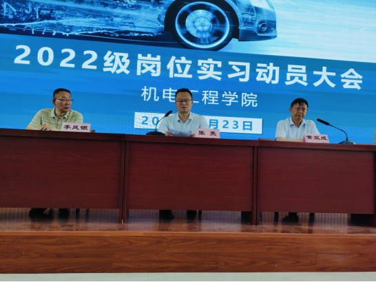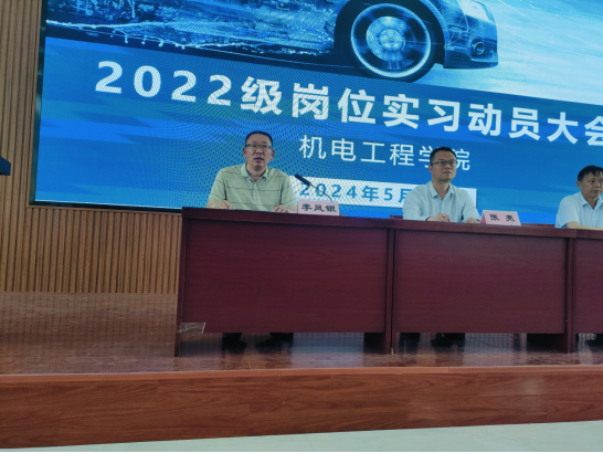 机电工程学院院长黄双成对岗位实习工作进行了动员和部署,介绍了岗位实习的政策依据以及现实意义分析了目前的就业形势,鼓励学生们做好岗位实习思想准备,以积极的态度和高度的责任感,认真对待岗位实习,遵规守纪,努力适应新环境,尽快进行角色转换学习专业技能,提升就业竞争优势