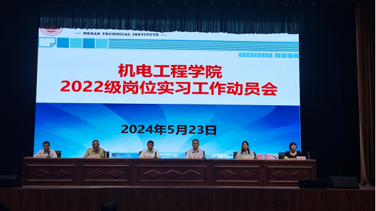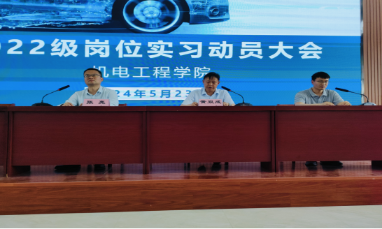 为加强2025毕业生岗位实习课程的认识,引导学生树立正确的实习观,2024年5月22日-23日机电工程学院在分别在东西校区召开岗位实习动员大会机电工程学院党总支书记张亮、院长黄双成、副书记耿丽敏、副院长李凤银22级辅导员、顶岗实习教师以及全体2022级学生参加大会,会议由办公室主任张光锋主持。