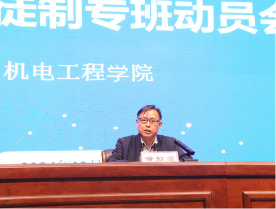 为进一步深化校企合作,提高人才培养质量,2024年10月10日,机电工程学院在学生活动中心召开了现代学徒制专班动员会,机电工程学院学院院长黄双成、党总支书记贾建树、22级现代学徒制专班的优秀学生代表李景瑞同学以及全体23级学生参加了会议,会议由副书记耿丽敏主持。