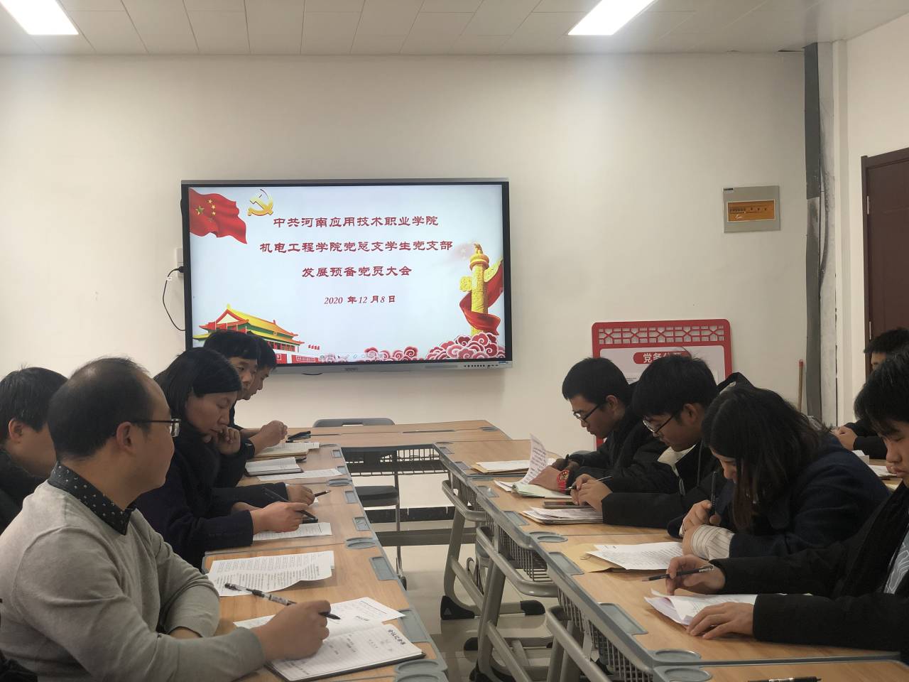 2020年12月8日,机电工程学院学生党支部在机电工程学院党员活动室召开了党支部大会,讨论接收张朝伟等15名同志为预备党员的问题。会议由党总支书记邓艳丽同志主持。