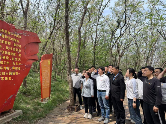 活动当日,参与人员首先来到五云山红色小道,大家拾阶而行,奋勇登高。沿途中,大家参观了五云山狙击战事迹、红色信仰精神、鏊子岗观景台、寨墙历史等红色展示模块。在参观过程中,大家深入了解了豫西抗战时期革命先烈们坚强不屈、奋勇抗敌的英勇事迹,深刻学习了不怕苦不怕死的 “皮旅” 精神。在鏊子岗观景台,部分党员还认真学习浏览了党章发展历史,进一步强化了党性修养。到达红色小道终点时,全体党员在现场庄严地重温入党誓词。面对鲜红的党旗,党员们紧握右拳,郑重宣誓,誓言铿锵有力、饱含深情,在重温誓词中缅怀革命先烈,铭记入党初心。