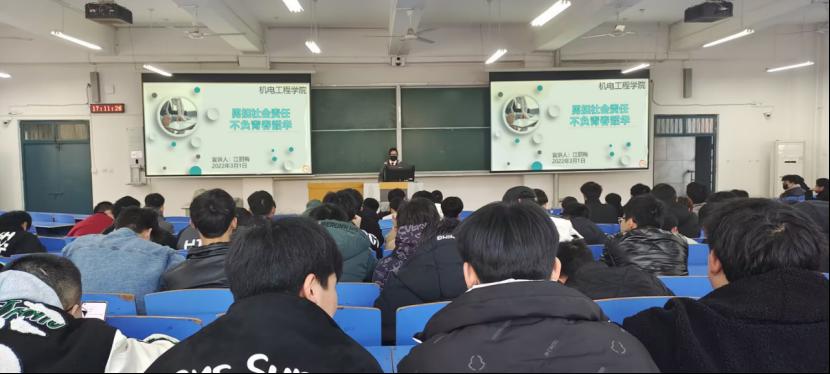 2022年2月21日,机电工程学院以“勇担社会责任,不负青春韶华”开展社会责任感主题教育活动,宣讲活动由资助专员江丽梅主持,部分学生代表加入会议。宣讲会上,资助专员江丽梅给学生们介绍了承担社会责任的价值。首先,服务社会可以体现人生价值,我们享受着社会提供的生活和学习条件,人人都有责任回报社会,为他人和社会服务。只有积极为社会作贡献,才能得到人们的尊重和认可,实现我们的价值。其次,服务社会能够促进我们全面发展。 在服务社会的过程中,我们的视野不断拓展,知识不断丰富,观察、分析、解决问题的能力以及人际交往能力不断提升,道德境界不断提高。希望机电工程学院的学子们,在日常生活中和寒暑假期间,积极参与志愿活动,回报社会。