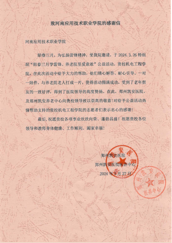 此次活动受到实践单位的高度赞扬和积极反馈,送感谢信到校。机电工程学院将持续开展关爱老人行动,将敬老爱老融入到社会实践中,引导广大青年学子积极投身社会公益事业,为建设和谐社会贡献青春力量。